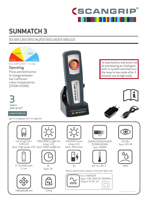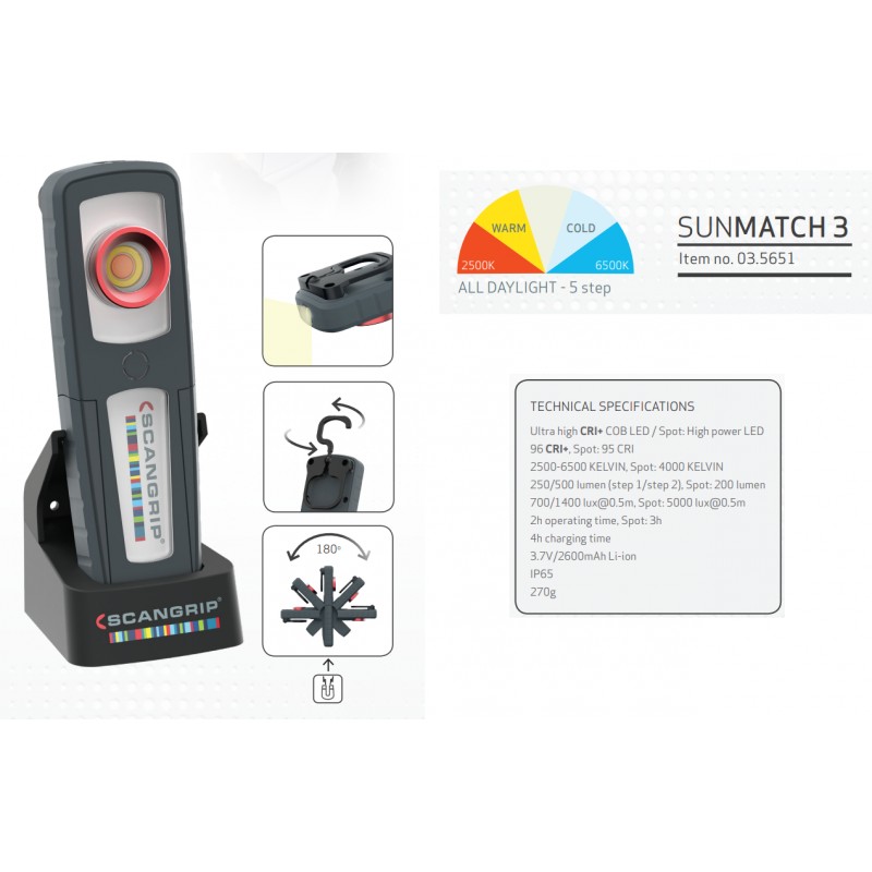 SCANGRIP SUNMATCH 3 با بهره گیری از لامپ های CRI+COB LED ضد گرد و غبار و نیز ضد آب طراحی شده است و نیز دارای لنز شیشه ای مقاوم نیز میباشد. نشانگر باتری نیز در قسمت جلوی این محصول تعبیه شده است که میزان شارژ باتری چراغ را نمایش میدهد.